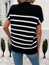Elevate your style with our Striped Mock Neck Short Sleeve Sweater! Perfect for adding a touch of sophistication to your wardrobe. This versatile piece boasts a comfortable mock neck and trendy stripes that will elevate any look. Upgrade your fashion game and make a statement with this must-have sweater.