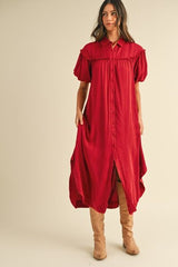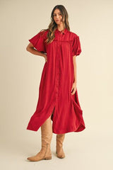Mineral Washed Button Down Puff Sleeve Shirt Dress