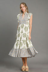 This midi dress features a mix of prints, combining different patterns for a unique and eclectic look. The ruffle cap sleeves add a touch of sweetness and charm to the design, creating a romantic and playful feel. The midi length offers a classic silhouette that is both stylish and versatile for various occasions. With its combination of prints and ruffle detailing, this dress makes a statement and stands out in a crowd. Perfect for adding a fun and trendy vibe to your wardrobe, this Mixed Print Ruffle Cap Sleeve Midi Dress is sure to turn heads.