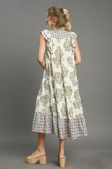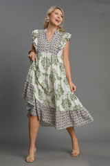 Mixed Print Ruffle Cap Sleeve Midi Dress Plus Size