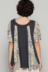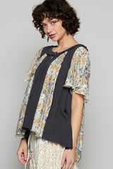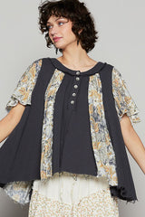 POL Frayed Hem Half Button Short Sleeve Printed Blouse